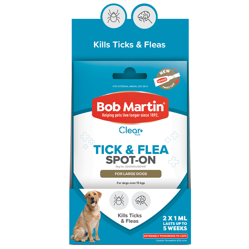 BOB MARTIN Clear Plus Spot-On For Large Dogs will give your dog up to 5 weeks protection against ticks and fleas. Should your dog have a severe infestation of ticks and fleas we suggest, for best results, you follow the Bob Martin Clear Plus Treatment Cycle below and