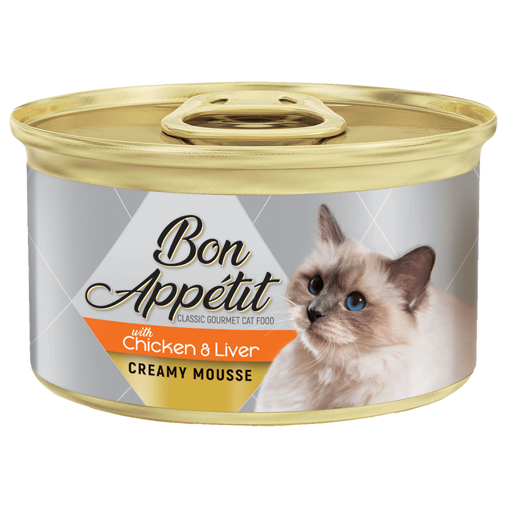 Combining the delicious flavours of roasted chicken and tender liver, Bon Appetit Creamy Mousse Chicken & Liver is the perfect spoil for your curious kitty. Loaded with vitamins and minerals for optimal health, our wet cat food can be enjoyed by all adult cats ages 1 – 7. Our Creamy Mousse range contains 82% moisture to keep your furry friend hydrated. Available in 85g x 12.