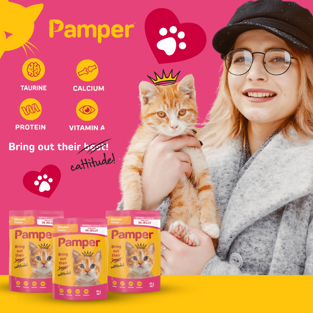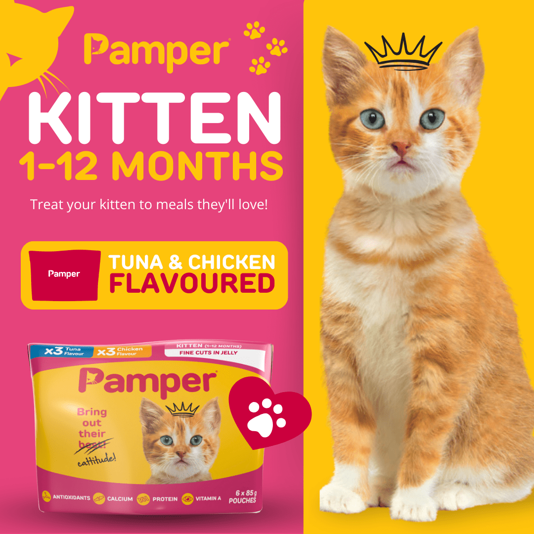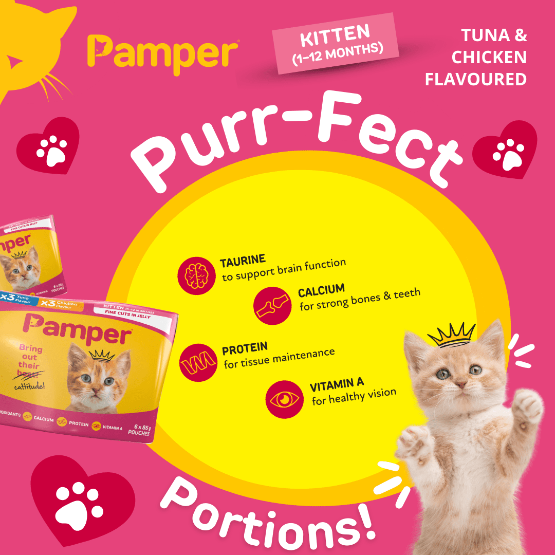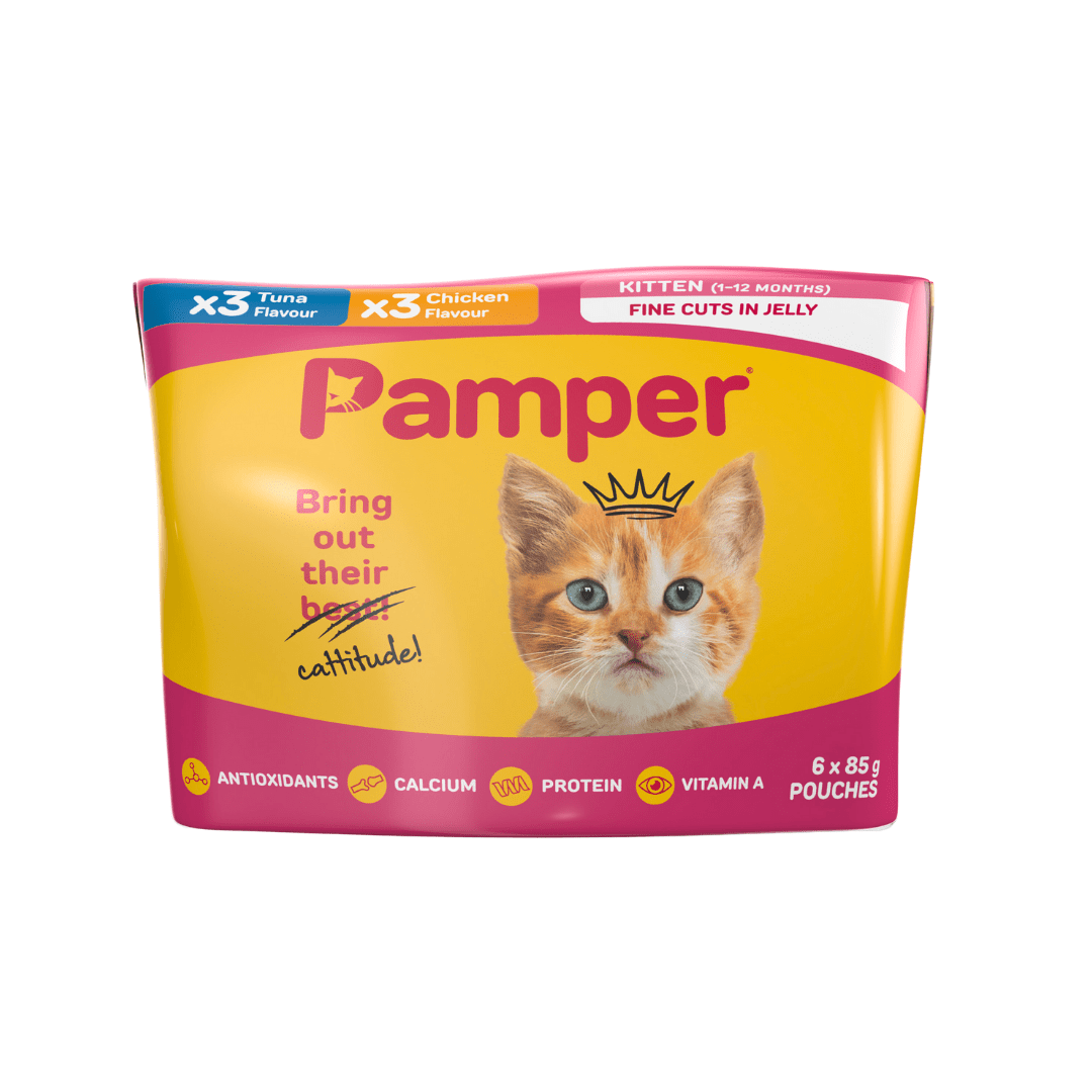 Help your fur baby grow big and strong when treating them to Pamper Kitten Tuna & Chicken in Jelly 6 pack. It has all the minerals your kitten needs to regulate their bodily functions, and contains calcium for strong bones & teeth, protein for lean muscles, and vitamins to boost their immunity. Our wet cat food is suitable for all kittens of 1 – 12 months.
