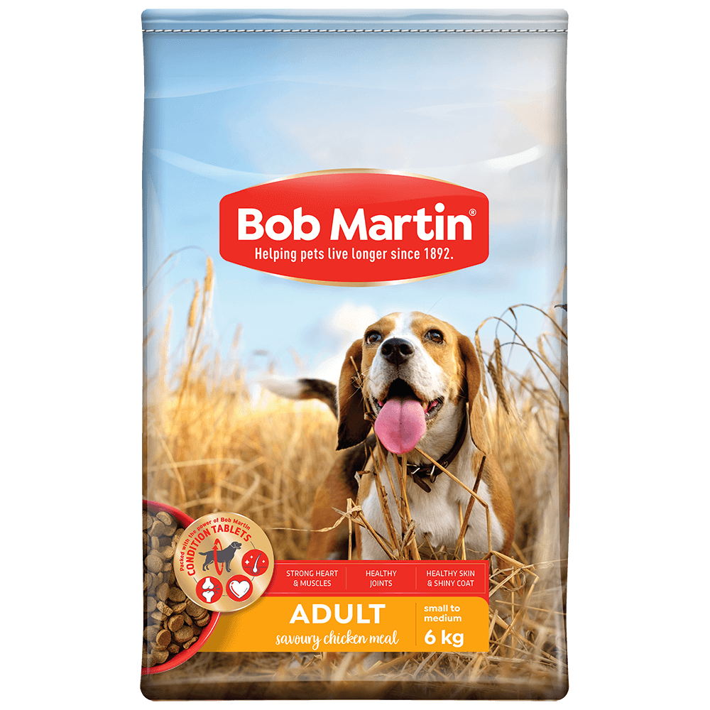 A healthy dog is a happy dog, and what better way to improve your furry friend’s vitality than with Bob Martin Chicken Savoury dry dog food. Each yummy pellet is packed with the power of Bob Martin Conditioning Tablets, leading to strong bones and shiny coats. Suitable for all adult dogs. Available in 6kg.